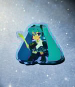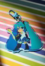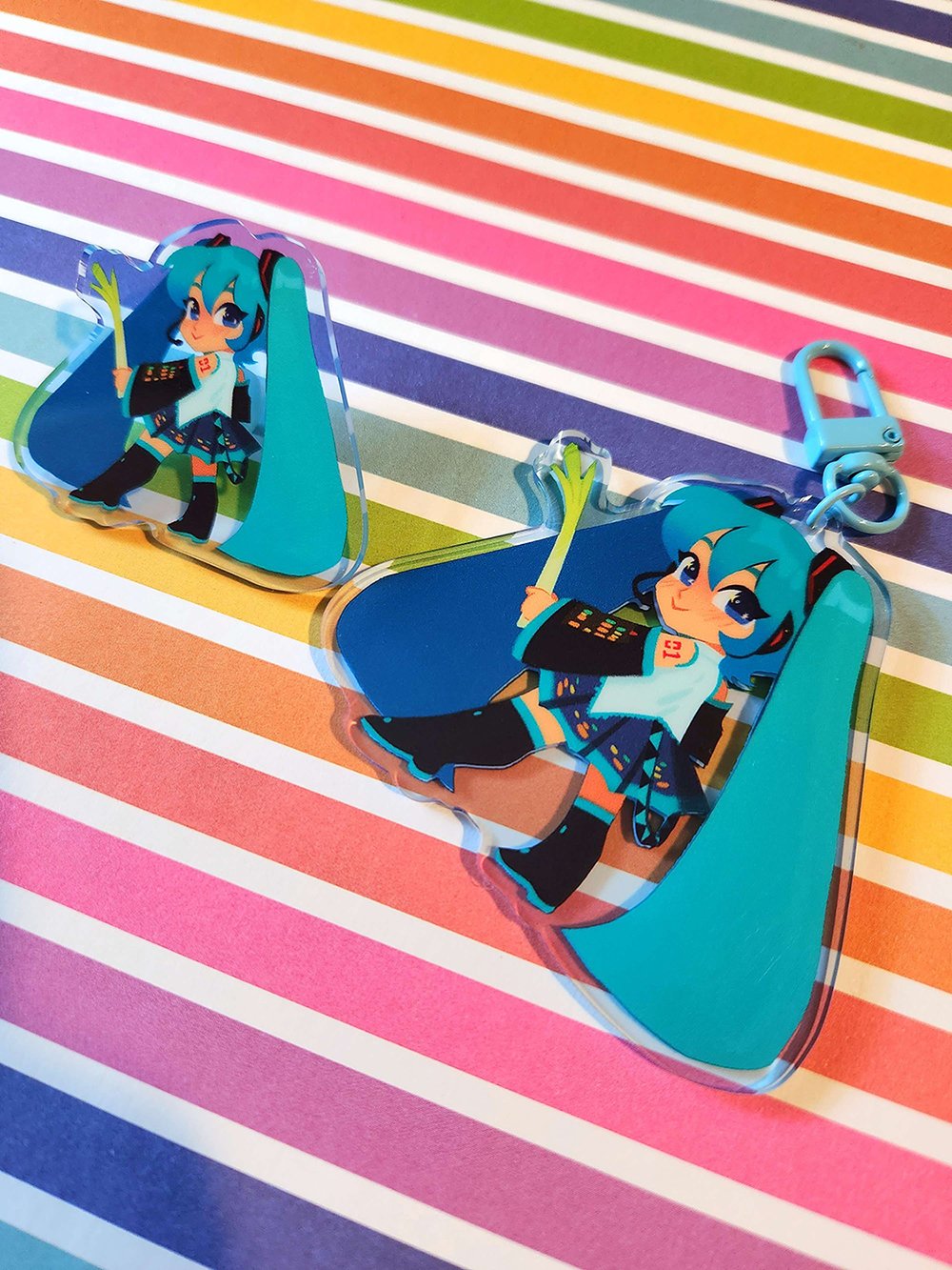 This 3" Charm is double sided on clear blue acrylic with a turquoise clasp. Carry Miku around with you anywhere!